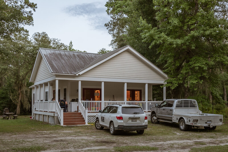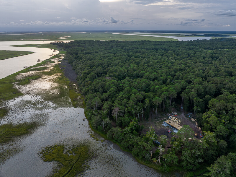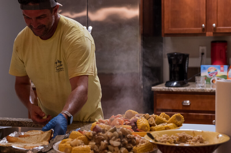 And then there’s food. When the nearest grocery store is miles (and a boat ride) away, you don’t just “grab something” after work. That’s where having a crew member like Tommy makes all the difference. A former restaurant owner, he took charge of meals—wearing gloves, using a thermometer, and treating dinner prep with the same level of care and precision as a timber frame layout. One night, he put together a classic Low Country boil—shrimp, potatoes, corn, and sausage—the kind of meal that makes the challenges of building in a remote location a little more enjoyable, and a lot more memorable.