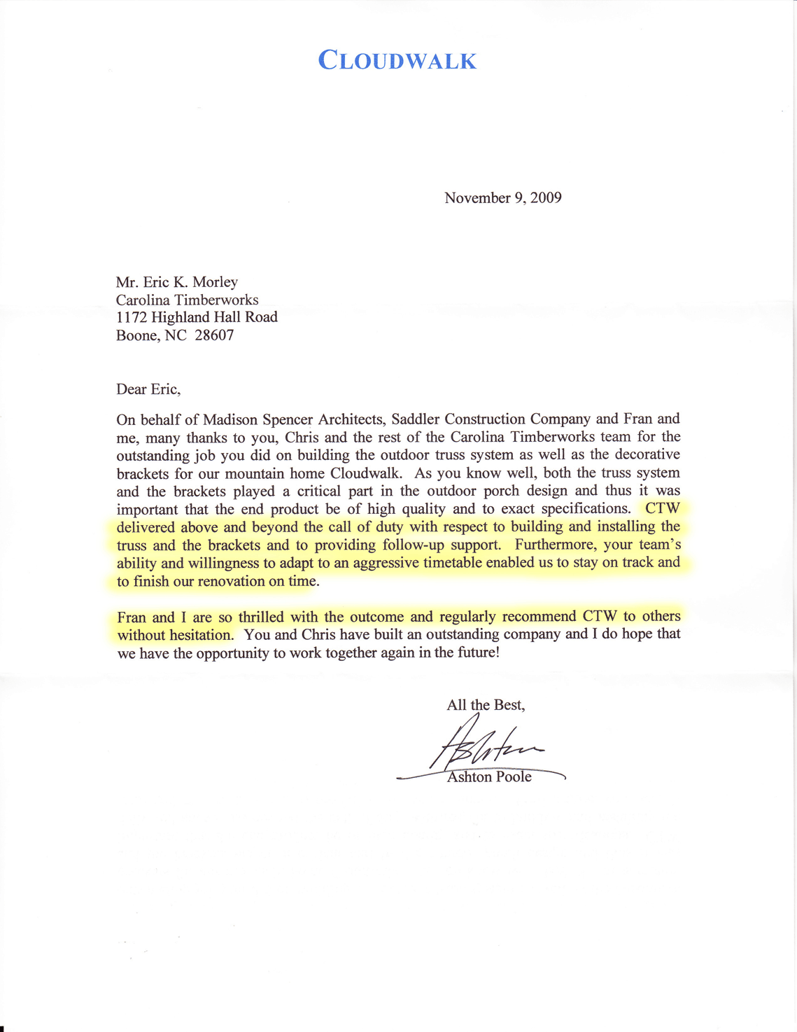 As you know well, both the truss system and the brackets played a critical part in the outdoor porch design and thus it was important that the end product be of high quality and to exact specifications. CTW delivered above and beyond the call of duty with respect to building and installing the truss and the brackets and to providing follow-up support. Furthermore, your team’s ability and willingness to adapt to an aggressive timetable enabled us to stay on track and to finish our renovation on time. Fran and I are so thrilled with the outcome and regularly recommend CTW to others without hesitation.
