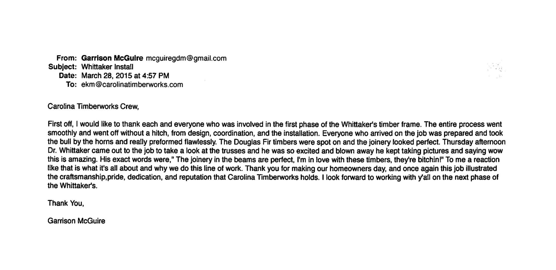 First off, I would like to thank each and everyone who was involved in the first phase of the Whitaker’s timber frame. The entire process went smoothly and went off without a hitch, from design, coordination, and the installation. Everyone who arrived on the job was prepared and took the bull by the horns and really performed flawlessly. The Douglas Fir timbers were spot on the the joinery looked perfect…. Thank you for making our homeowners’ day, and once again this job illustrated the craftsmanship, pride, dedication, and reputation that Carolina Timberworks holds.